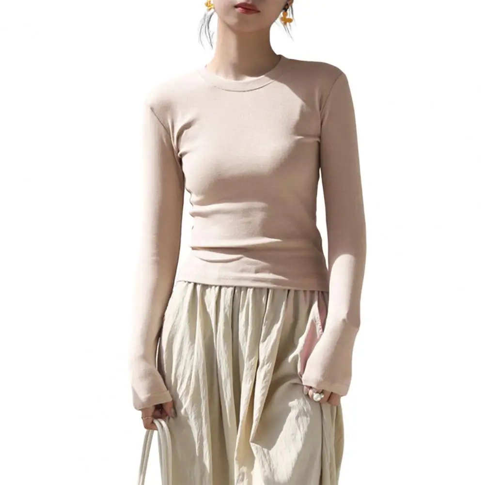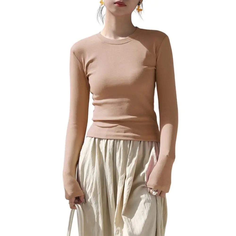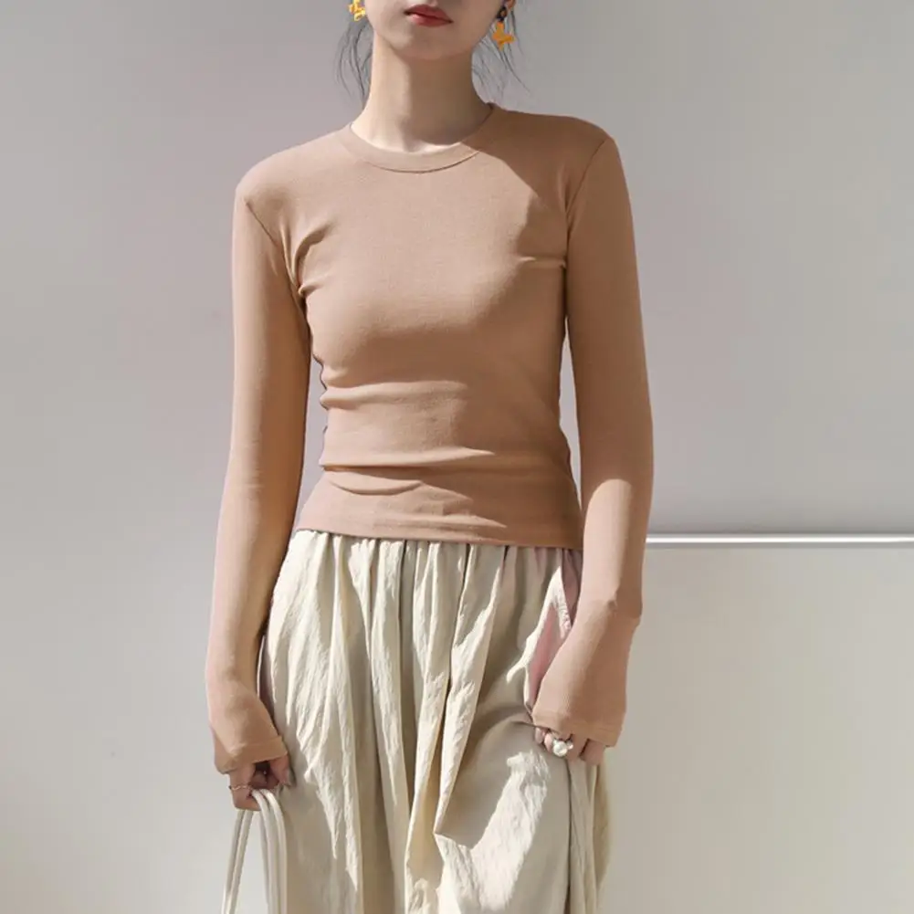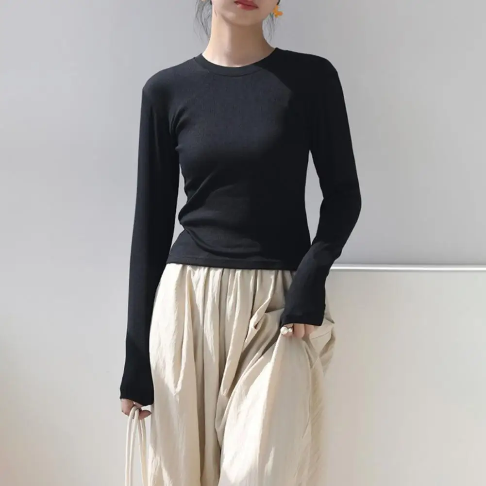 Women T-shirt Round Neck Long Sleeve Slim Fit Tee Shirt Solid Color Lightweight Versatile Tops Leisure Wear