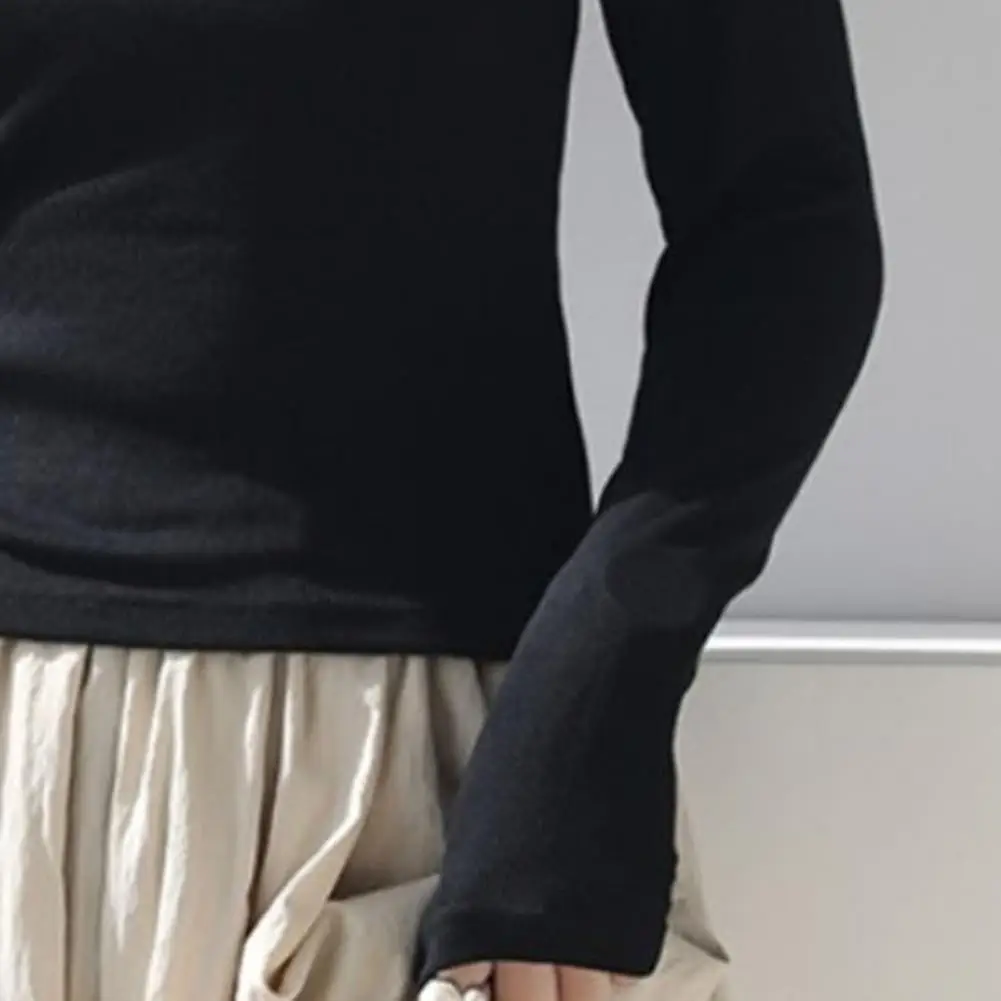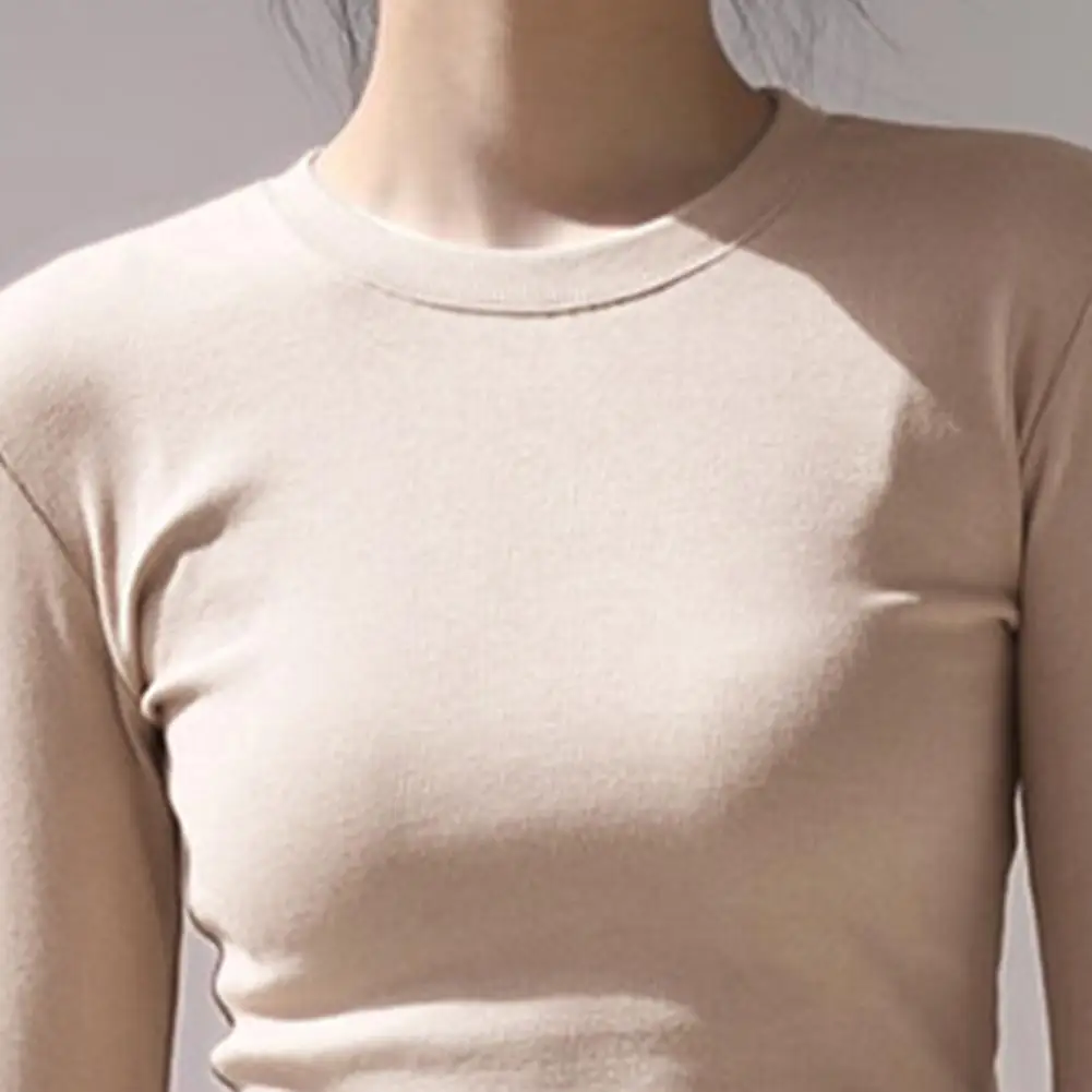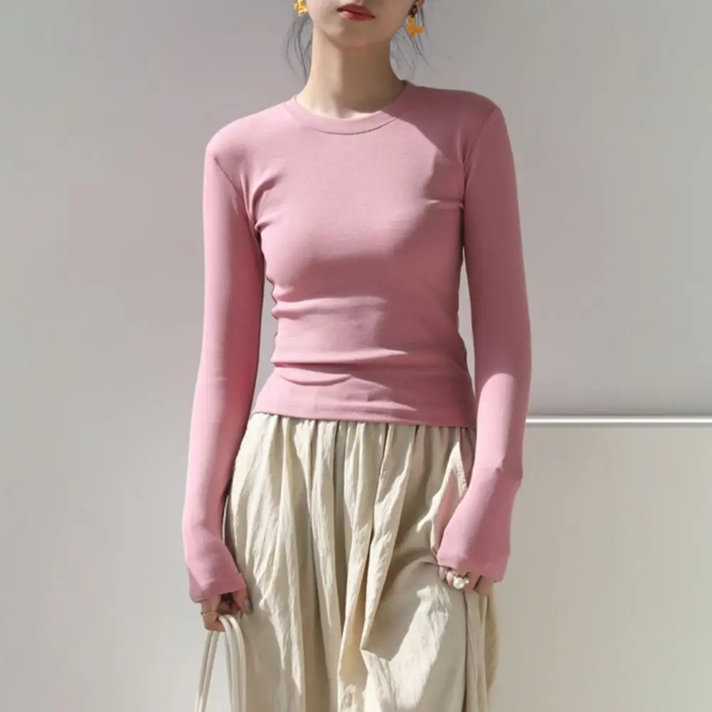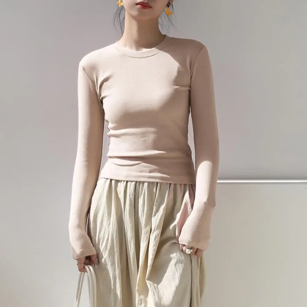 Women T-shirt Round Neck Long Sleeve Slim Fit Tee Shirt Solid Color Lightweight Versatile Tops Leisure Wear